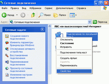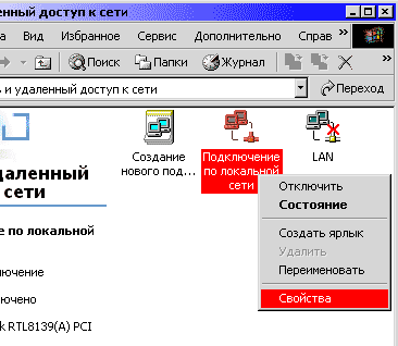 4. У вікні Сетевые подключения щёлкните по подключению по локальной сети правою кнопкою миші і, в меню, що з'явилося, виберете пункт Свойства: