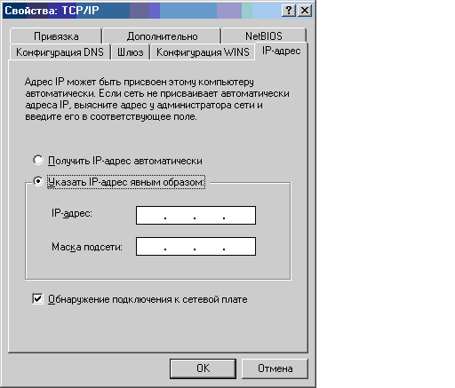 Якщо вибрано значення Manually, в діалоговому вікні вкажіть Ваш Ip-адрес. Необхідно також ввести дані про маску підмережі, адресу маршрутизатора і адресу сервера імен.