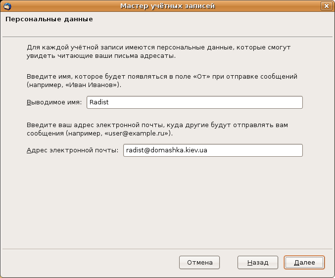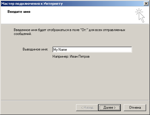 4. Укажите ваше имя, которое будет отображаться во всех посылаемых вами сообщениях и нажмите кнопку Далее (Next).