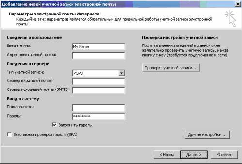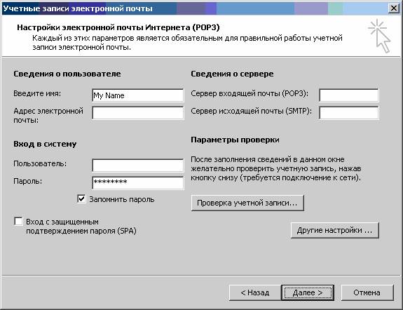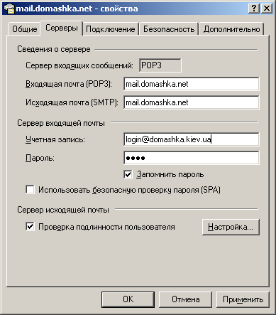 6. В поле Пользователь (Username) укажите логин для доступа к почтовому серверу. В качестве такого логина используйте ваш e-mail. Например, если ваш e-mail name@domashka.kiev.ua, то в качестве логина укажите name@domashka.kiev.ua.