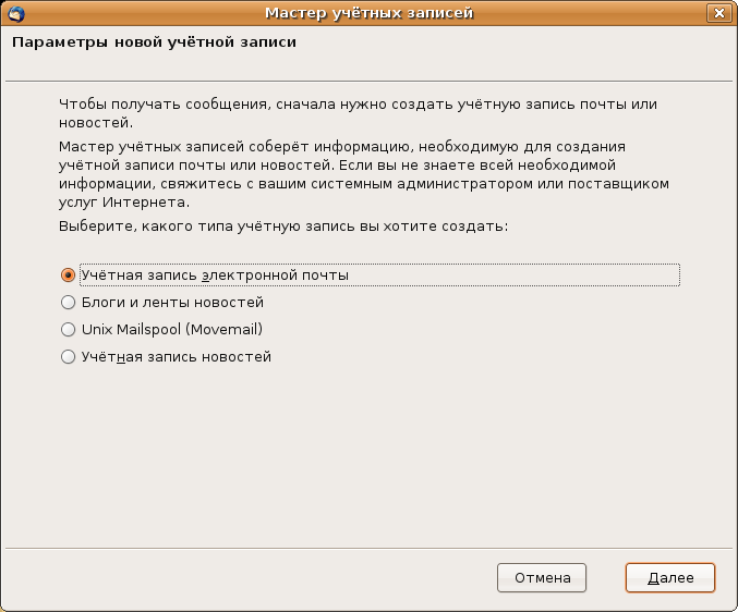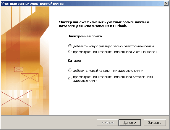 2. Виберіть пунктДобавить почтовый ящик (Add a new e-mail account) и натисніть кнопку Далее (Next).