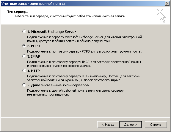 3. Виберіть тип сервера вхідних повідомлень POP3 і натисніть кнопку Далее (Next).