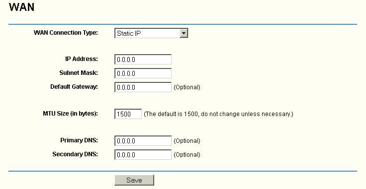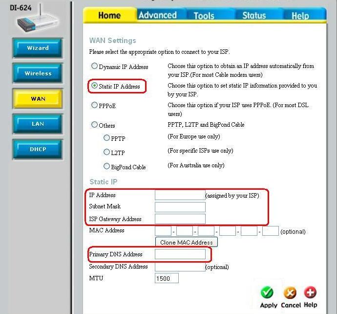 8. Натисніть «WAN», виберіть Static IP. Заповніть інші поля згідно Налаштуваннь виданими Вам при підключені.