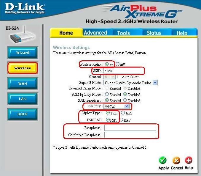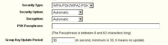 6. Перейдіть у закладку Wireless оберіть Interface. Виберіть WPA/WPA2 шифрування та введіть пароль аунтифікації який будете використовувати при підключенні: