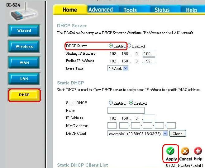 15. Налаштування DHCP (Динамічна видача адрес). Перейдить в розділ DHCP.