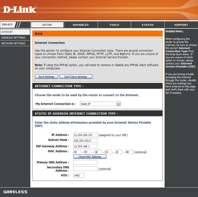 13. В розділі «WAN», оберіть «Static IP», після чого заповните наступні поля згідно картки абонента