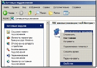 4. У вікні Мережні підключення натисніть на підключення по локальній мережі правою кнопкою миші і, в меню що з'явилося, виберіть пункт Властивості: