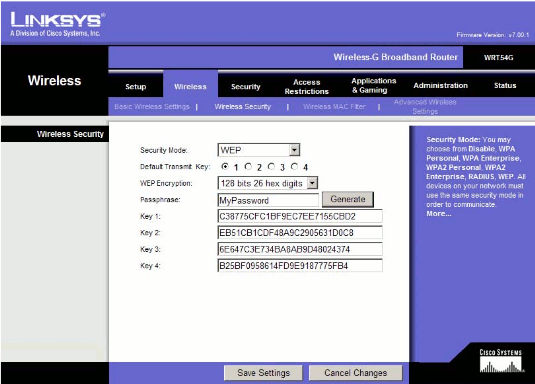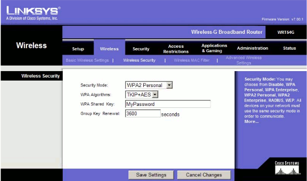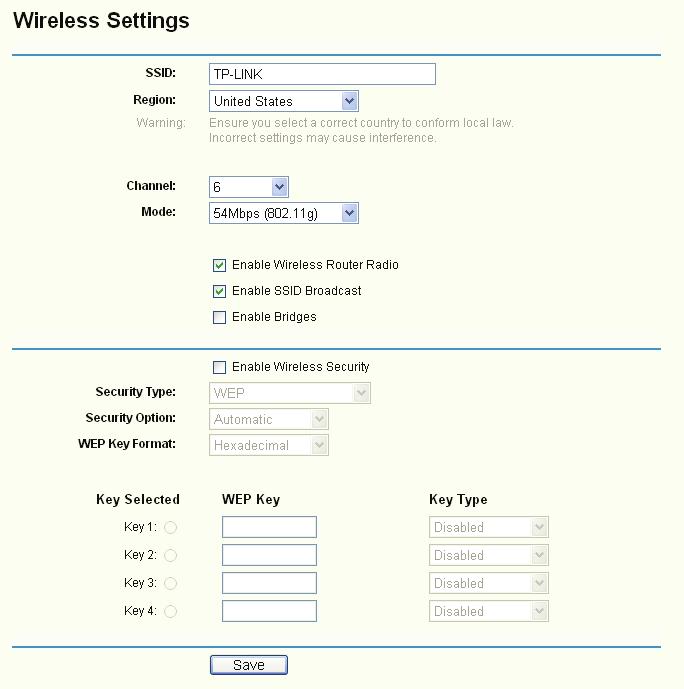 9. Перейдіть у меню «Wireless → Wireless security» і оберіть метод шифрації передаваємої информації через бездротову мережу. Рекомендується встановити режим «WPA2 Personal» або «WPA Personal», якщо ваше устаткування не піддтримує режим WPA то встановіть режим WEP. Не залишайте бездротову мережу відкритою.
