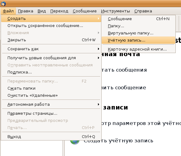 1. Для створення поштової скриньки, оберіть пункт меню "Файл -> Створити -> Обліковий запис...";