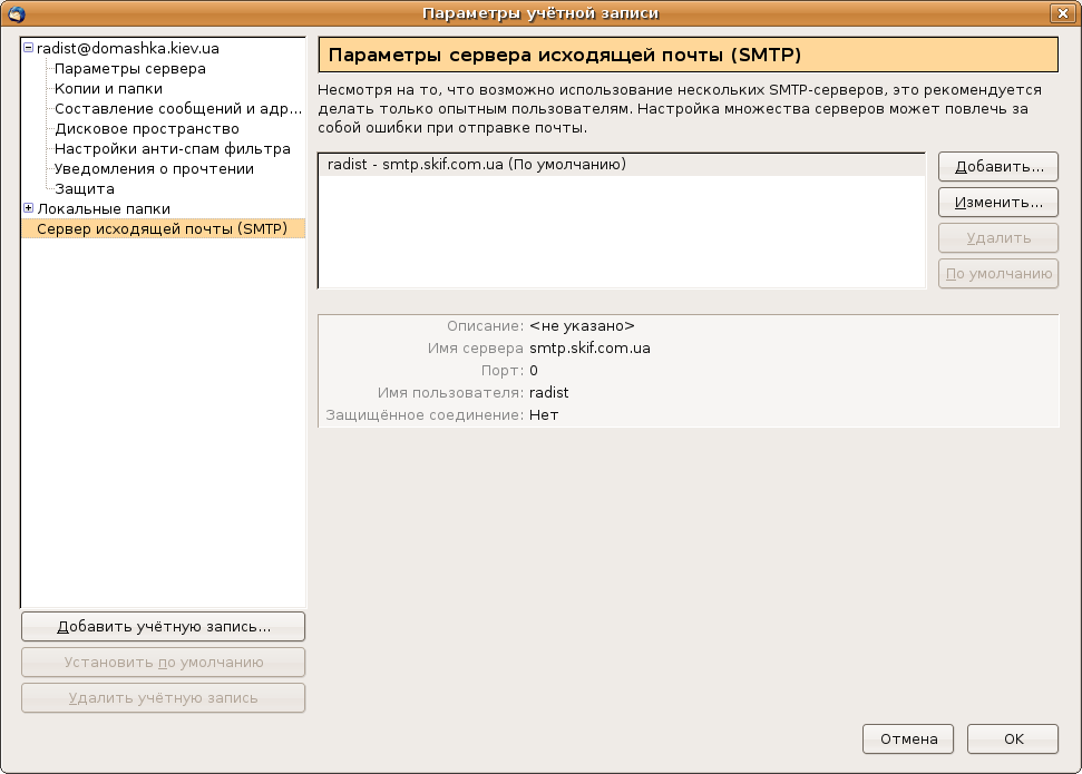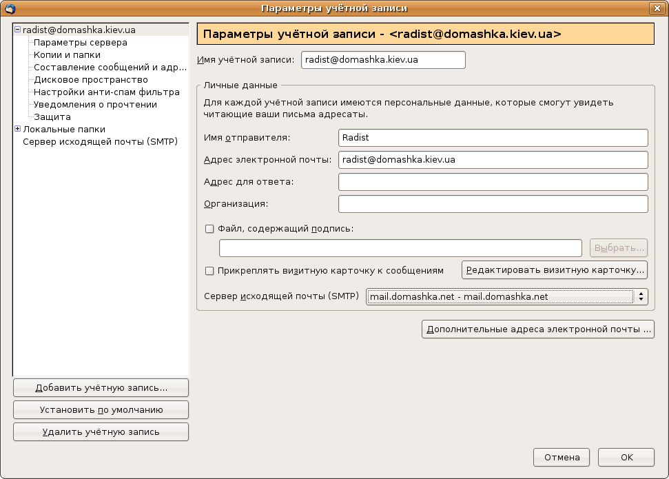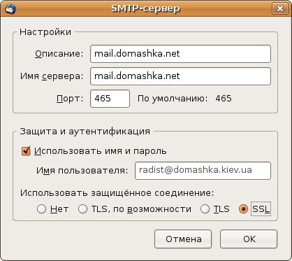 Сервер исходящих сообщений (Outgoing mail server) укажите mail.domashka.net.