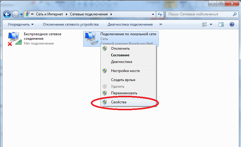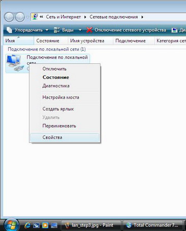 3. В появившемся окне нажмите на Подключение по локальной сети правой кнопкой мышки и выберите пункт Свойства: